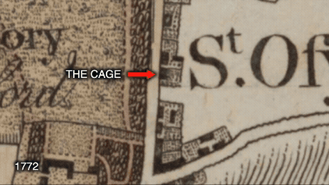 The location of the lockup has been disputed in the past mainly due to lack of records that date back to 1582. However, hand drawn surveyor maps dating back as early as 1772 are detailed enough to feature The Cage. When overlayed with modern satellite imagery there is a building consistently marked across multiple surveyor maps spanning throughout the 18th century through to today, dispelling any doubt about its location in recent times.